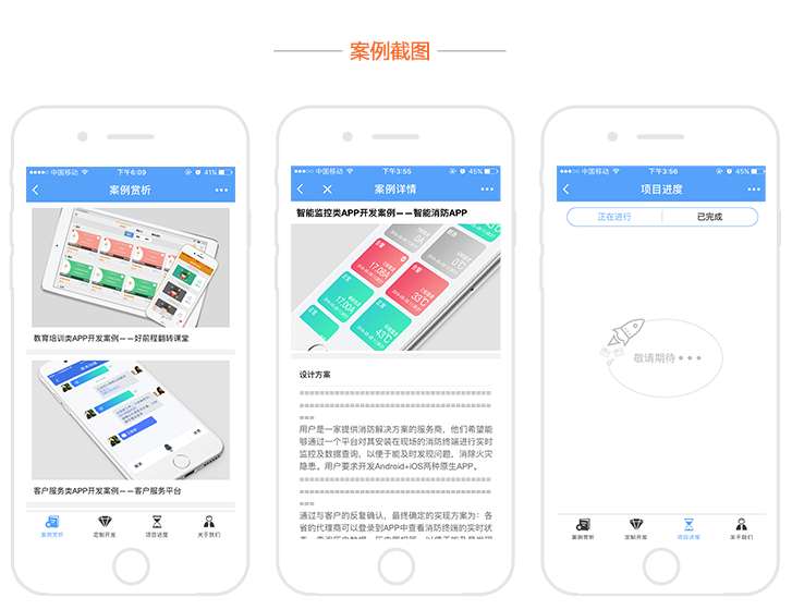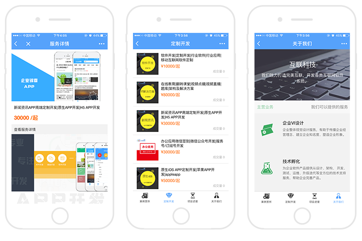 该项目重点为了宣传推广公司,分为案例赏析、定制开发、项目进度、关于我们四部分。案例赏析模块用于展示公司之前的精品案例;定制开发模块用于展示公司可以提供的定制开发服务;项目进度模块为用户提供查看项目进度的入口,即如果用户与我们合作成功,我们会让客户看到项目整体的开发进度,让客户心理有数;关于我们模块是对公司业务的简单勾勒。