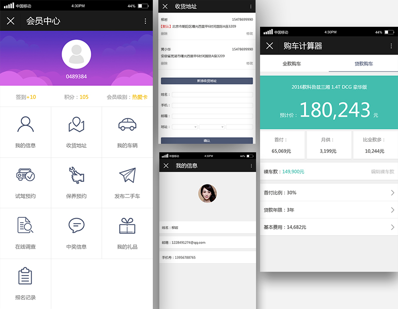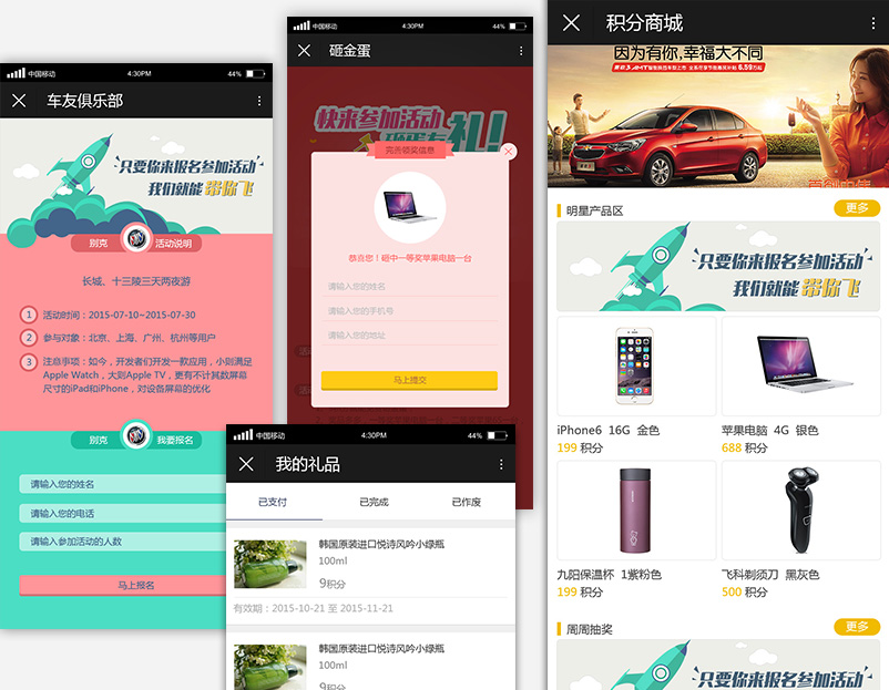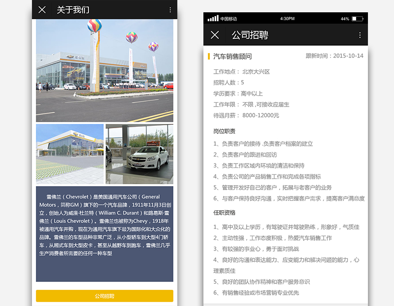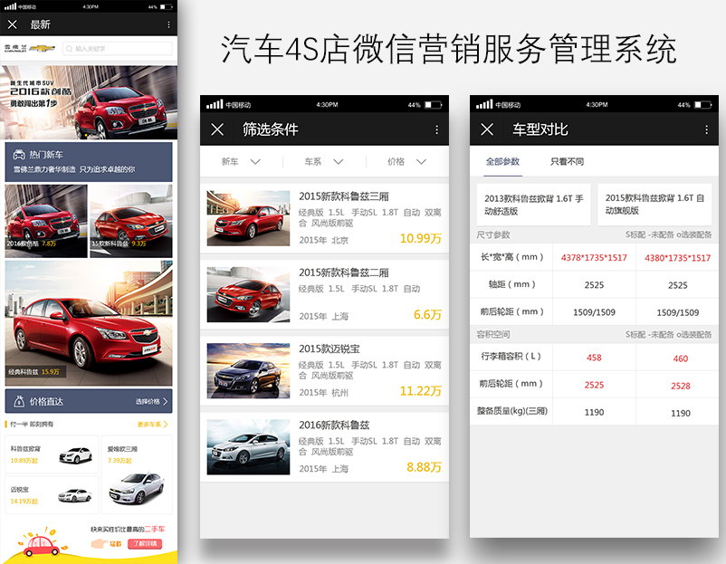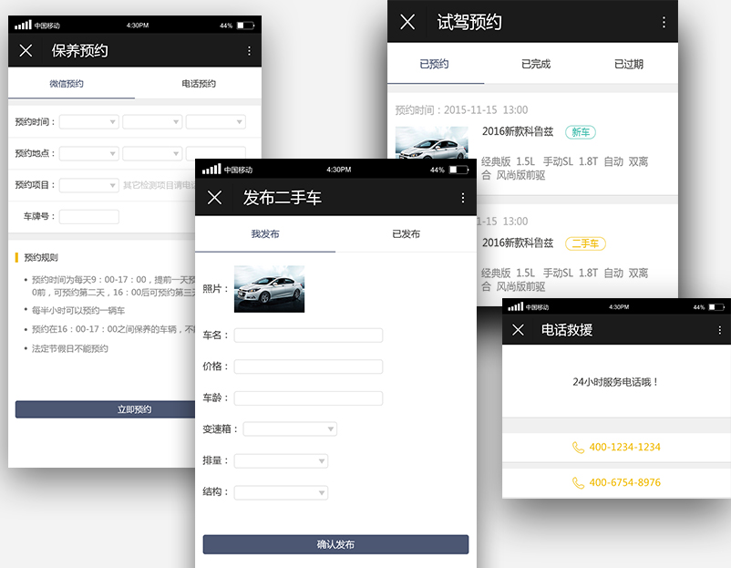 汽车4S店微信营销服务管理系统是分别为别克和雪佛龙两个汽车品牌开发的微信端服务管理系统。 在微信公众号中为用户提供汽车信息展示、在线购买、服务预约(保养预约、维修预约、试驾预约)、二手车信息发布、积分商城积分消费、车友俱乐部活动管理、用户中心等功能。 4S店通过本项目,可以在后台管理用户信息,通过活动和积分商城与用户实现互动,同时可以为为类汽车4S店模式的商户,提供的适用于连锁店经营管理系统,侧重用户信息积累与数据分析,以提高服务效率,规范服务管理方式。