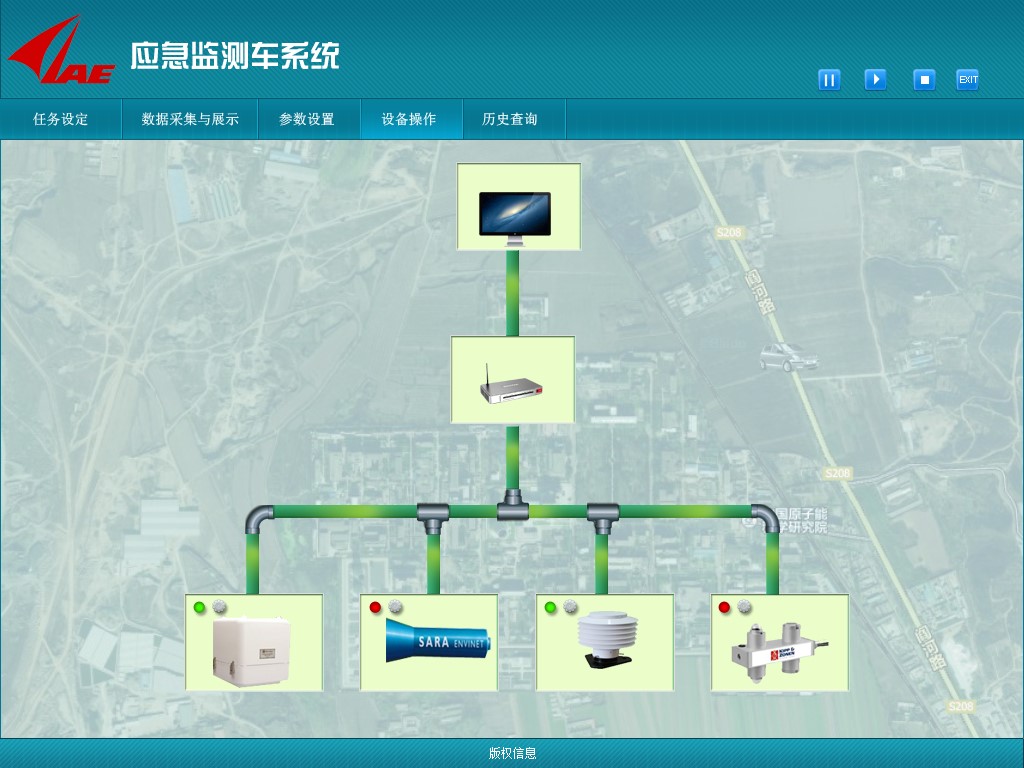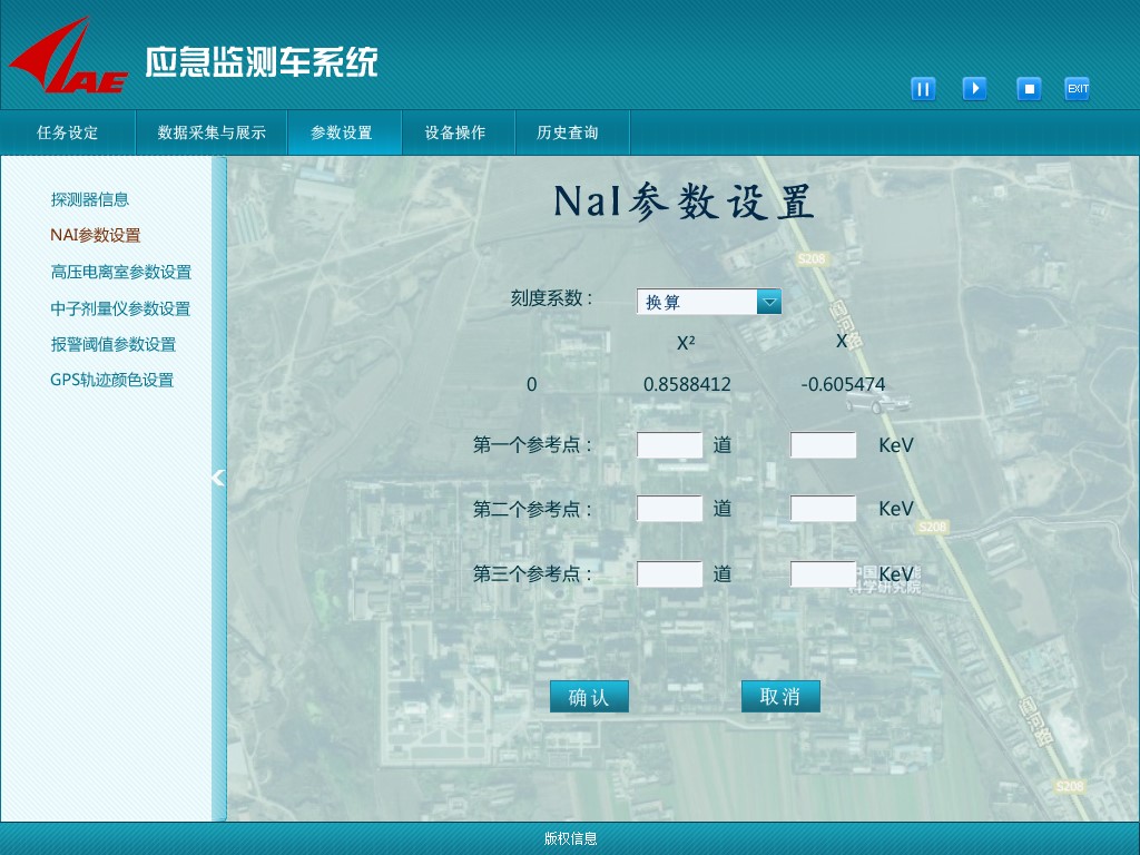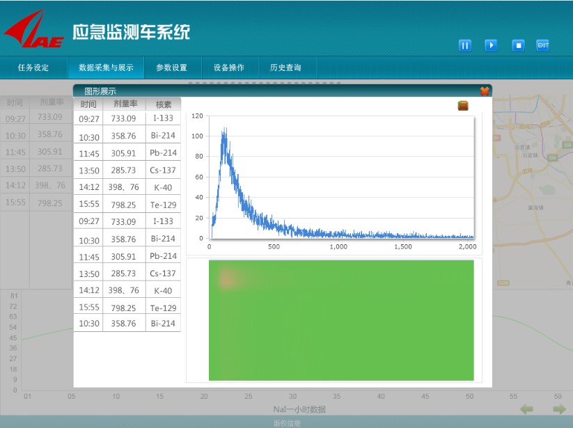 核辐射应急监测车辐射监测系统用于处理监测车每次出行执行不同任务,对空气中核元素信息进行实时采集,分析车辆经过区域的元素信息,以达到对空气中核元素监测的目的。可以及时发现不同区域辐射剂量率的变化,对异常变化进行预警,也适合在核事故后,通过监测车采集数据,实时获取大气污染情况的变化,便于应急决策。 监测车采集对象主要有:NAI采集、电离室采集、中子采集,以及对GPS定位信息的采集。本系统按功能模块划分为五大模块分别为:任务设定、数据采集与展示、参数设置、设备操作、历史查询。应急监测车主要以一次任务为主,所以在任何模块都可对当前执行任务进行操作,均可进行暂停,恢复,终止等操作,并且可退出此系统。
