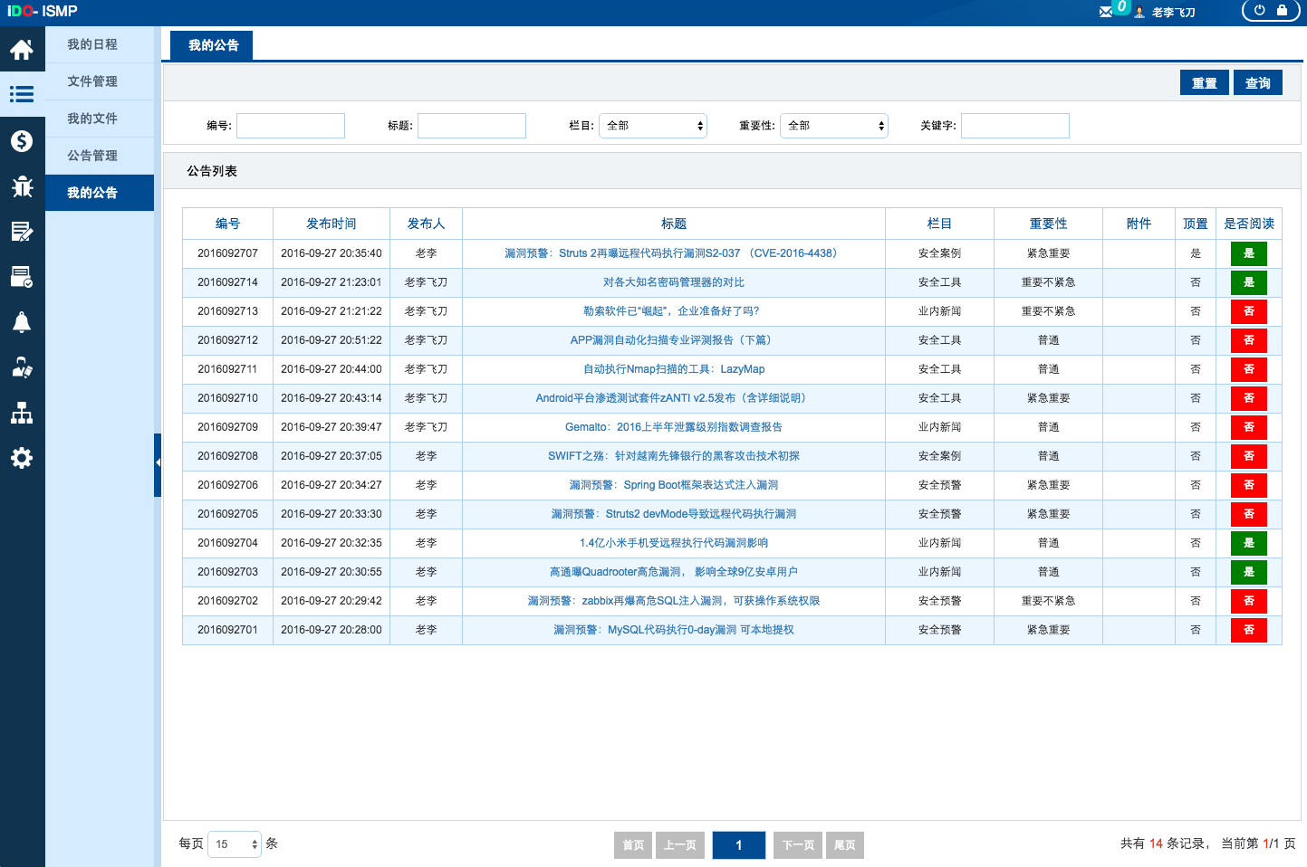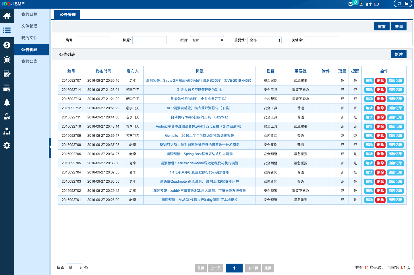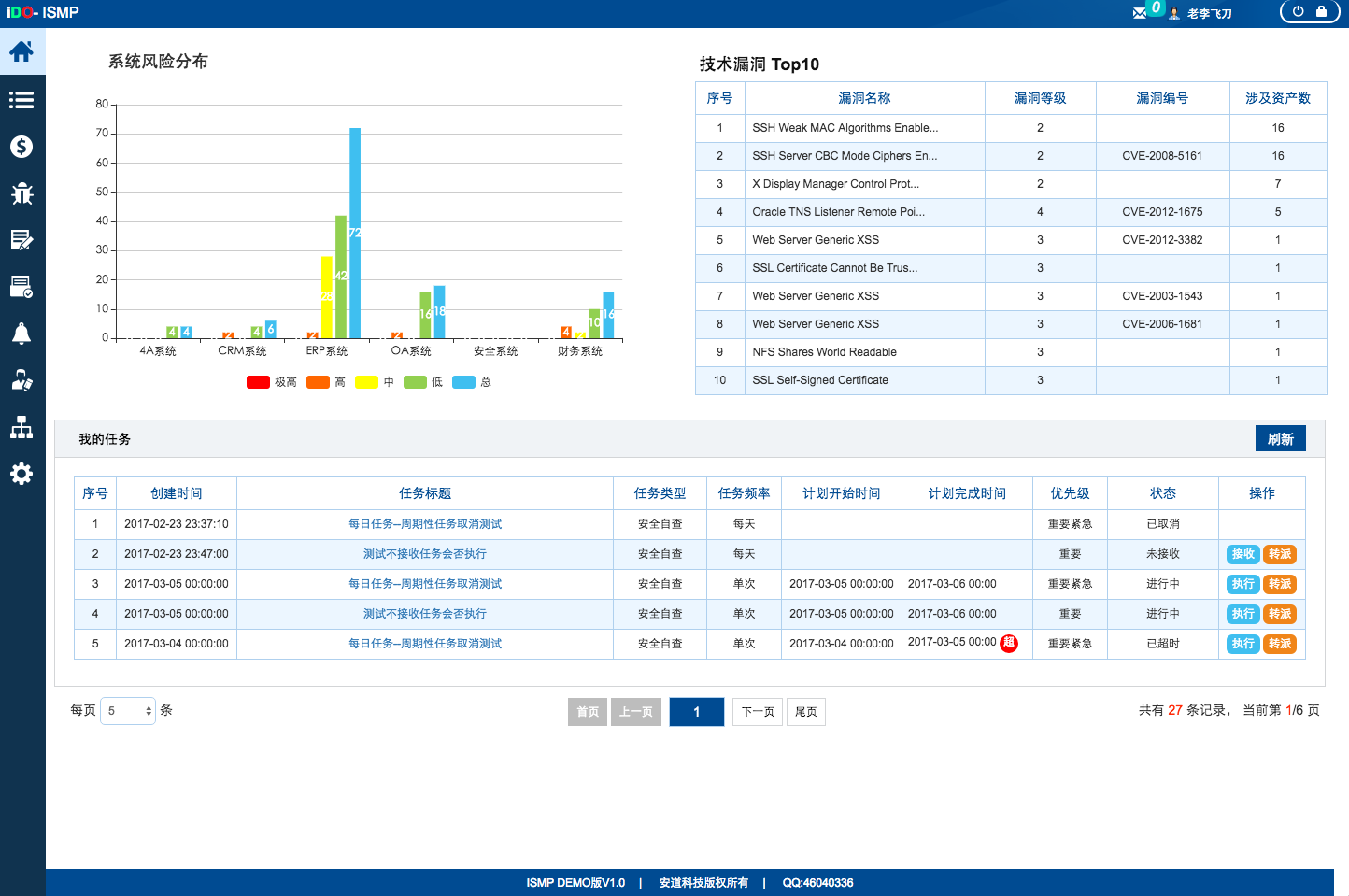 给广州安道科技有限公司定制的一套安全管理平台(产品)。 该项目是为各个大型企业提供设备安全保障的一个监管平台,主要包含公告通知、漏洞中文库、漏洞管理、文件管理、设备管理、访问控制管理、资产管理、问卷管理、任务管理、风险管理、统计报表等模块。 该产品较为复杂,模块与模块之间关联性较强,但是能极大的提高企业的效率。能够很方便的监控各个设备的安全状态,及时进行整改处理。